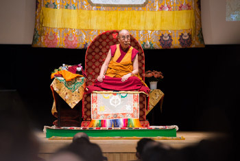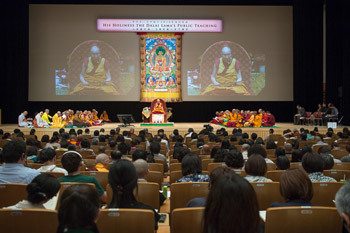His Holiness the Dalai Lama speaking on the first day of his four day teaching in Osaka, Japan on May 10, 2016.