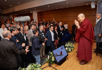 His Holiness the Dalai Lama greeting the audience at the Science et d'Ingenierie Supramoleculaires' auditorium of the University of Strasbourg in Strasbourg, France on September 16, 2016. Photo/Olivier Adam