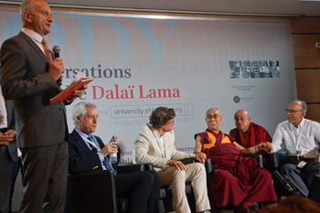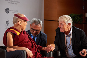 Jean-Gerad Bloch and Giles Bertschy look on as His Holiness the Dalai Lama comments on the presentations the Body, Mind, Science dialogue at the University of Strasbourg in Strasbourg, France on September 16, 2016. Photo/Olivier Adam