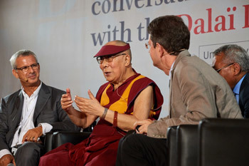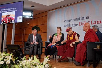 His Holiness distinguished between a basic biological sense of compassion that tends to be biased and partisan and a genuine compassion based on reasoning such as the argument that others want to live a happy life and don’t want suffering, just as I do. Ricard pointed out the degree of courage involved in cultivating great compassion. He also observed that co-operation is far more effective than competition.