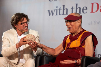 The fourth and final session, Consciousness, was moderated by B Alan Wallace. He introduced Steven Laureys a neurologist who studies coma and Michel Bitbol a polymath who functions as a philosopher. Laureys, who had brought a brain with him to illustrate what he had to say, declared that he wants to know, “What happens when matter becomes mind?” His Holiness remarked, “I really doubt that it does.” And Laureys retorted, “Can you be conscious without your brain?” He made his approach clearer when asserting that the scientific proof of life after death involves organ donation.