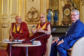 The Collège des Bernadins invited all the members of the panel to lunch, after which they dispersed. His Holiness the Dalai Lama drove to INALCO, the National Institute of Oriental Languages and Civilisations. He was met on arrival by the President, Manuelle Franck and member of the Tibetan Faculty, Françoise Robin. Young Tibetans offered a traditional welcome and escorted him to the auditorium where students of Tibetan language recited auspicious verses in Tibetan.