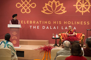 Monks from Drepung Loseling Monastery opened proceedings by chanting the verse for taking refuge and generating bodhichitta, followed by a prayer for His Holiness’s long life. The compere, Ms Komal GB Singh, briefly explained that since His Holiness had had a busy year, many in India had not had the opportunity to congratulate him and wish him well on his actual 80th birthday in July 2015. She called on the principal organizer Mr Analjit Singh to introduce the occasion.