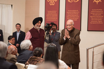 New Delhi, India, 4 January 2016 - His Holiness the Dalai Lama was very welcomed in Delhi today by old friends who wished to celebrate his reaching his 80th birthday. The event included a vivid exhibition of photographs that His Holiness took interest and pleasure in viewing, as images reminded him of people he’s met and places he’s been. Likewise, after a leisurely lunch, when His Holiness joined the party he was pleased to spot and greet old friends in the audience.