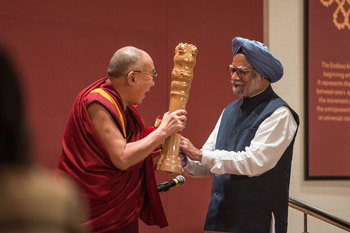 On behalf of the organizers, Dr Manmohan Singh presented His Holiness with a carved sandalwood replica of the Lion Capital that adorned the Ashokan Pillar in Sarnath. The four lions back to back represent power, courage, pride, and confidence and are now one of the emblems of India. Sarnath is where the Buddha first taught the Four Noble Truths.