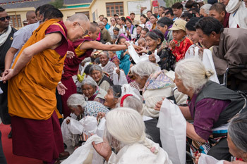 His Holiness the Dalai Lama greeting elderly members of the Tibetan community on his arrival at SOS TCV Choglamsar in Ladakh, J&K, India on August 7, 2016.