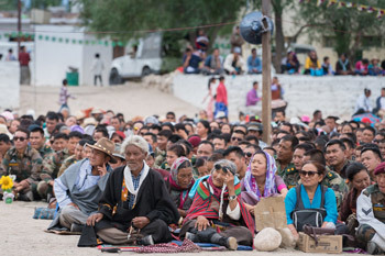 Members of the local community listening to His Holiness the Dalai Lama speaking at the SOS TCV Choglamsar school football ground in Ladakh, J&K, India on August 7, 2016. Photo/Tenzin Choejor/OHHDL
