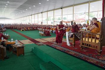 Mundgod, Karnataka, India, 6 July 2016 - On the occasion of his 81st birthday His Holiness the Dalai Lama joined a large assembly of monks from Tibetan monasteries of all traditions across India, who had gathered to make a Long Life Offering to him. The event was organized by representatives of the Gelug Order of Tibetan Buddhism and the Doeguling Tibetan Settlement where His Holiness has been a guest for nearly a week.