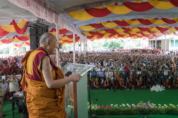 His Holiness the Dalai Lama speaking to the crowd of more that 14,000 during celebrations to mark his 81st birthday in Mundgod, Karnataka, India on July 6, 2016. Photo/Tenzin Choejor/OHHDL