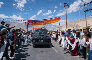 | Some of the thousands of people lining the road from the airport to Shewatsel Phodrang to greet His Holiness the Dalai Lama as he arrives in Leh, Ladakh, J&K, India on July 25, 2016. Photo/Tenzin Choejor/OHHDL |