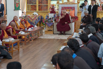 | His Holiness the Dalai Lama speaking at the assembly hall of Shewatsel Phodrang in Leh, Ladakh, J&K, India on July 25, 2016. Photo/Tenzin Choejor/OHHDL |