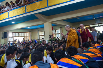 Dharamsala, HP, India, 26 April 2016 - It was a bright spring morning today as His Holiness the Dalai Lama drove down through Dharamsala town and on through the neat tea gardens below Chilgari. Jacaranda trees were in bloom and flocks of brilliant green parakeets swooped across the road on the way to the College for Higher Tibetan Studies (CHTS) at Sarah. His Holiness was met on arrival by Institute of Buddhist Dialectics (IBD) Director, Ven Geshe Kalsang Damdul and Principal of the College, Ven Geshe Jampal Dakpa, who escorted him into the assembly hall.