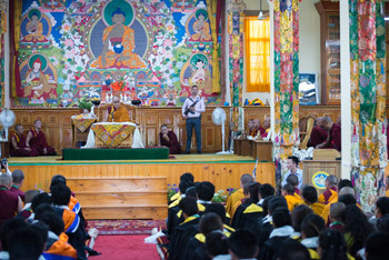 He mentioned that Tibetan schools have taken up traditional debate since 2012 and that a handbook for teaching it is in preparation. He also noted that the secular ethics curriculum recently prepared in draft form at Emory University is being tried out at the Peton School. He ended his speech with a wish that His Holiness the Dalai Lama live long.