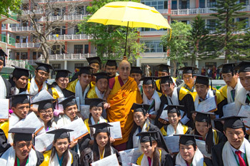 His Holiness the Dalai Lama with graduates after the College for Higher Tibetan Studies (CHTS) at Sarah's graduation ceremony in Dharamsala, HP, India on April 26, 2016.
