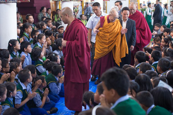 The event is organized by the Tibetan Children’s Village School and the local Introductory Buddhist Study Group. As he emerged through the gates of his residence, His Holiness was offered the traditional ‘chema changpu’. The aisle up the middle of the yard was lined by about 40 Tibetan girls, each holding flowers and incense in their hands, who, singing a school song, escorted His Holiness up to the door of the temple. He saluted the statue of the Buddha and greeted several Lamas before taking his seat on the throne.