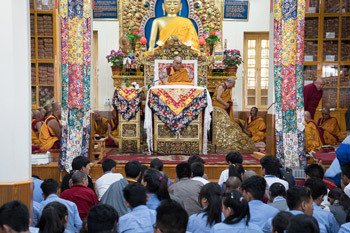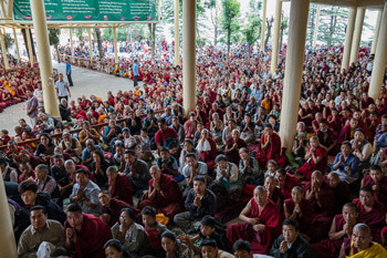Thekchen Chöling, Dharamsala, HP, India, 1 June 2016 - The Tsuglagkhang, the Main Tibetan Temple, and the surrounding yard were packed with 10,000 people today for the first of three days’ public teachings by His Holiness the Dalai Lama. They included 2500 school students from Upper and Lower TCVs, as well as class 10-12 students from TCVs at Gopalpur, Suja, Selakui and Chauntra. In addition, students were invited from the Sherab Gatsel Ling (Transit) School, the Men-tsee-khang and Sarah. They were joined by 600 college students, approximately 2000 foreigners from 66 countries and another 5000 members of the Tibetan public.