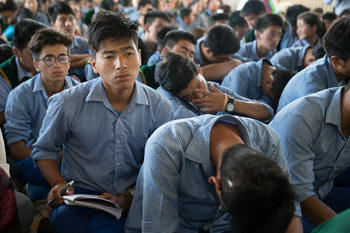 His Holiness began by explaining that although it had become customary to hold this annual series of teachings at Upper TCV, this year it was decided that it would be more convenient at the Tsuglagkhang. He expressed pleasure that after centuries in which dialectics and debate were the sole preserve of the monasteries, its use among students and other lay-people is taking root. He also remarked that studying subjects like maths has little effect on our inner development, whereas if we study what the Buddha taught we gain the conviction necessary to transform our minds. He mentioned that there had been some exercise of debate in schools in the early days in exile, but it faded away. Now that it has been revived he has suggested referring to the concerned instructors as teachers of philosophy rather than as religious teachers.