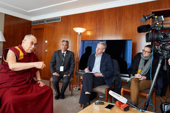 His Holiness the Dalai Lama speaking to journalists in Geneva, Switzerland on March 11, 2016. Photo/Olivier Adam