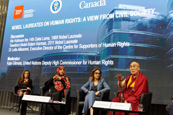 In the afternoon, His Holiness the Dalai Lama, fellow Nobel Laureate Tawakkol Abdel-Salam Karman and Leila Alikarami, an Iranian lawyer and human rights activist representing Nobel Laureate Shirin Ebadi, engaged in discussions on the theme ‘Nobel Laureates on Human Rights - A view from civil society’ at the Graduate Institute of Geneva. This event, hosted by the Permanent Missions of the United States and Canada to the United Nations, took place on the periphery of the UN Human Rights Council's 31st session. Mrs. Kate Gilmore, UN Deputy High Commissioner for Human Rights moderated the event.