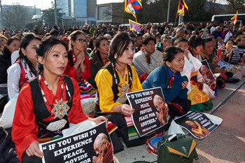 Many of the 3000 members of the Tibetan community listening to His Holiness the Dalai Lama at the Palais des Nations in Geneva, Switzerland on March 11, 2016. Photo/Olivier Adam