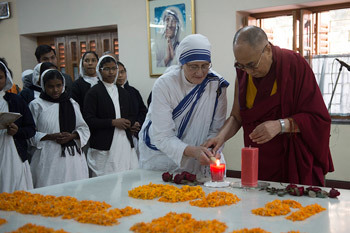 | His Holiness the Dalai Lama lighting a candle at the tomb of Mother Teresa during his visit to Missionaries of Charity's Mother House in Kolkata, West Bengal, India on January 12, 2015. Photo/Tenzin Choejor/OHHDL |