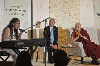 Q'orianka Kilcher then performed a song which began with a poignant flute piece. She then sang from the piano about the interdependence between the earth, sky, oceans, animals, and forests, as well as the gift we have to raise the next generation. Remarking that the flute evoked for him the vast grasslands of Tibet, His Holiness added: