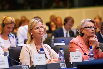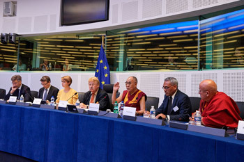 Strasbourg, France, 15 September 2016 - As His Holiness the Dalai Lama arrived at the European Parliament this morning, the flags of member states arrayed outside flew freely in the breeze, lit by the early morning sun. His visit began with a meeting with President of the European Parliament, Martin Schulz. This was followed by discussions with Elmar Brok, Chairman of the European Parliament’s Committee on Foreign Affairs, prior to meeting with the Committee. Welcomed as an advocate of freedom, human rights and protecting the environment, His Holiness was given the floor.