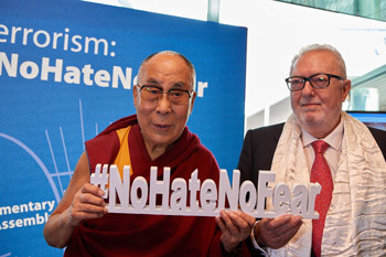 His Holiness the Dalai Lama supporting a youth campaign to counter terrorism #NoHateNoFear with Mr. Pedro Agramunt, President of the Parliamentary Assembly at the Council of Europe in Strasbourg, France on September 15, 2016. Photo/Olivier Adam
