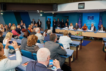 Leaving the Committee on Foreign Affairs to warm applause and the press and clamour of people wanting to shake His Holiness’s hand or take selfies with him, he drove the short distance to the Council of Europe. He was greeted at the start of this official visit by Head of Protocol, Rafael Benitez who escorted him and his delegation to the Palais de l’Europe. He was welcomed by Secretary General Thorbjørn Jagland, and signed the Golden Book of the Council of Europe. He held a short meeting with the Secretary General before being welcomed by Pedro Agramunt, President of the Parliamentary Assembly and signing its Golden Book. Following their short meeting, Mr Agramunt solicited His Holiness’s support for a youth campaign to counter terrorism - #no hate no fear.