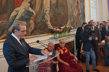 At Strasbourg City Hall Tibetans offered His Holiness a traditional welcome. He was received by Mayor Roland Ries and his wife who escorted him inside. During a short reception he signed the Golden Book and was presented the Marcel Rudloff Tolerance Prize. He joined a number of religious leaders for a lunch hosted by Mayor Ries.