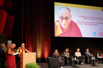 During a public talk at Strasbourg Convention billed as ‘The Dalai Lama Chooses Strasbourg to Meet Young People’ and attended by 900 students and 1100 members of the public, His Holiness was cheered as he took the stage. Speaking English translated into French by Ven Matthieu Ricard, he said: