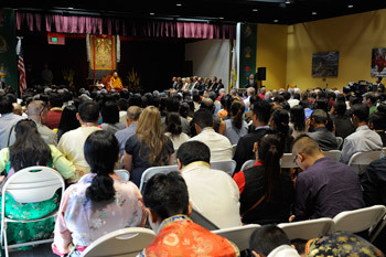 Members of the audience listening to His Holiness the Dalai Lama speak at the new Utah Tibetan Community Hall in Salt Lake City, Utah, USA on June 22, 2016. Photo/Thom Gourley