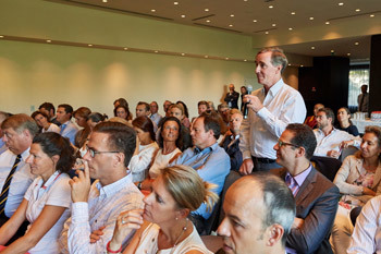 A member of the Young Presidents' Association asking His Holiness the Dalai Lama during their meeting in Brussels, Belgium on September 12, 2016. Photo/Olivier Adam