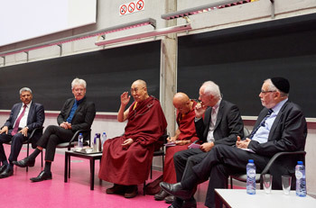 At the University of Louvain, to the south-east of Brussels, His Holiness joined a panel including: Mgr Jozeph De Kesel, Archbishop of Mechelen-Brussels; Albert Guigui, Chief Rabbi of Belgium; Salah Echallaoui, President of the Muslim Executive of Belgium and Steven Fuite, President of the United Protestant Church of Belgium to engage in an interfaith dialogue before an audience of 1000 students. The conversation took place in French, with His Holiness’s remarks being translated by Ven Matthieu Ricard.