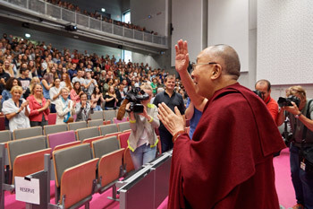 His Holiness the Dalai Lama greeting the audience as he arrives to join in an inter-faith dialogue at the University of Louvain in Brussels, Belgium on September 12, 2016. Photo/Olivier Adam