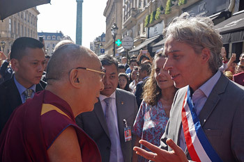 Mayor of Paris’s 2nd Arrondissement Jacques Boutault welcomes His Holiness the Dalai Lama on his arrival in Paris, France on September 12, 2016. Photo/Jeremy Russell/OHHDL