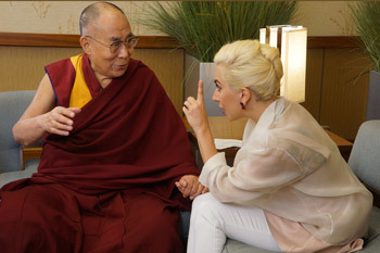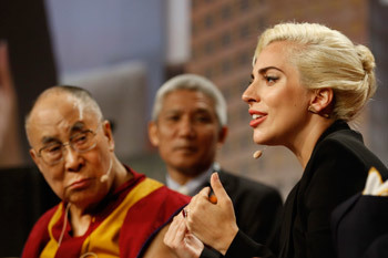 His Holiness the Dalai Lama looks on as Lady Gaga adds her comments during their interactive discussion at the US Conference of Mayors in Indianapolis, IN, USA on June 26, 2016. Photo/Chris Bergin