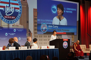 Ann Curry introducing His Holiness the Dalai Lama before his address to the US Conference of Mayors in Indianapolis, IN, USA on June 26, 2016. Photo/Jeremy Russell/OHHDL