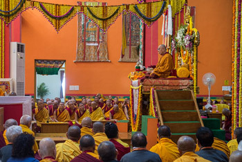 Tashi Lhunpo, Bylakuppe, Karnataka, India, 1 January 2016 - Today’s White Tara Longevity Empowerment and Offering of Requests to His Holiness the Dalai Lama to Live Long took place inside the new Tashi Lhunpo Assembly Hall. Once he had completed necessary preparations, as prayers were recited, His Holiness addressed the congregation of Abbots, former Abbots, Tulkus, monks, nuns and lay-people.