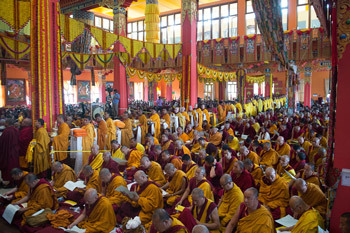 Offerings being made during the Long Life Offering ceremony for His Holiness the Dalai Lama at Tashi Lhunpo Monastery's Assembly Hall in Bylakuppe, Karnataka, India on January 1, 2016. Photo/Tenzin Choejor/OHHDL