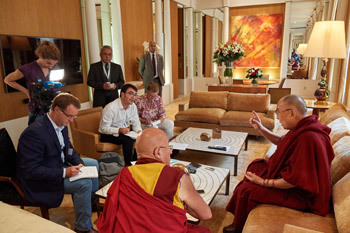 Paris, France, 13 September 2016 - Representatives of several news agencies including Agence France-Presse, Le Croix (Christian Daily News), and Le Point (a weekly news magazine) conducted an interview together with His Holiness the Dalai Lama this morning. They began by asking how to talk about happiness in France and he replied that this was a question asked in many developed countries. Material goals and material development can be very helpful, but of limited benefit. They provide physical comfort without affecting our mental unease.