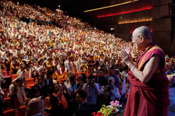 His Holiness the Dalai Lama greeting over 3100 members of the Tibetan community on his arrival at the Palais du Congress in Paris, France on September 14, 2016. Photo/Olivier Adam