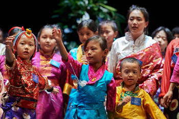 Young Tibetans preforming for His Holiness the Dalai Lama during his meeting with members of the Tibetan community at the Palais du Congress in Paris, France on September 14, 2016. Photo/Olivier Adam