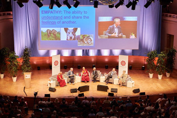He praised Mind & Life for paying attention not only to material developments, but also to their accompanying inner values. The result he hopes to see is more widespread physical well-being and inner peace. He pointed out that it is not only those who believe in religion who need love and compassion—we all do. Although studying chimpanzees can tell us something about human behaviour, His Holiness remains sceptical about what it can reveal about human intelligence, the misuse of which leads to conflict.