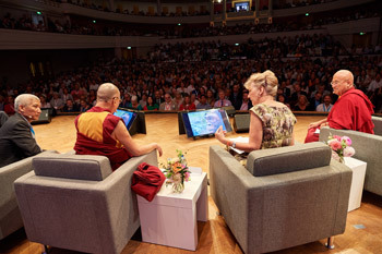 Once His Holiness and the first session’s panellists, as well as the audience of 1900 people had taken their seats, Managing Director of Mind & Life Europe, Sander Tideman welcomed them to the 31st Mind & Life dialogue, the first in Brussels, the capital of Europe. He expressed gratitude to all who had contributed to the organization of the event, particularly the volunteers. In his welcoming remarks Pierre Gurdjian President of The Université libre de Bruxelles (ULB) suggested that one aspect of the theme of the conference—Power & Care—was leadership, remarking that those who want to change the world are leaders.