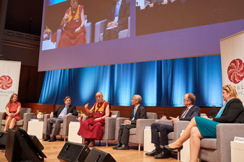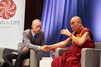 His Holiness the Dalai Lama thanking Prof Johan Rochström after his presentation at the Bozar Centre in Brussels, Belgium on September 9, 2016. Photo/Olivier Adam