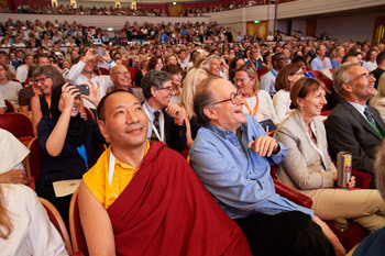 Many of the over 1900 people attending the Mind & Life Dialogue enjoying a moment of laughter during Prof Dr Markus Heinrichs' presentation at the Bozar Centre's Henry le Boeuf Hall in Brussels, Belgium on September 9, 2016. Photo/Olivier Adam