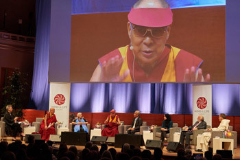 “It’s indeed a great honour to be here to participate in these discussions,” His Holiness began, “one of my three commitments is to promote harmony among religious traditions. There is a solid basis for this because they all advance a common practice of love and to protect it counsel tolerance, forgiveness and self-discipline. There are differences in their philosophical views, the existence and role of a creator or the conduct of non-violence, for example, but all support the practice of love. These different views appeal to people of different dispositions at various times in various place.
