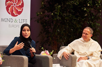 Brother Thierry-Marie Courau looking on as Alaa Murabit speaks at the Mind & Life Dialogue in Brussels, Belgium on September 10, 2016. Photo/Olivier Adam