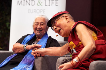 His Holiness the Dalai Lama commenting on Mauri elder Pauline Tangiaora's presentation at the Mind & Life Dialogue in Brussels, Belgium on September 10, 2016. Photo/Olivier Adam